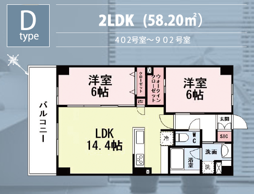 | 設備 | ガス(LPG)、エアコン、温水洗浄便座、シャンプードレッサー、追焚き、浴室乾燥、対面キッチン、ウォークインクローゼット、TVドアホーン、インターネット無料、オートロック、宅配BOX |